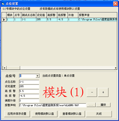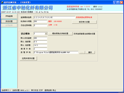 測溫鉑電阻(標準PT100)感應工藝點溫度,輸入安裝于現場的測溫模塊,每個模塊可接12個鉑電阻;由一對RS485標準總線,將分布于車間各區(qū)域的測溫模塊(最多32個)連接起來,組成鏈狀網絡,通過RS485適配器,送入上位機(監(jiān)控室普通電腦);電腦內安裝本公司提供的專用軟件,接收來自測溫模塊的溫度數據,以表格形式進行控溫點、報警點的設定和顯示,各監(jiān)測點報警聲可自行錄制,通過電腦音箱輸出。并可按設定的時段保存各點溫度記錄,各測溫點的名稱可由用戶自行定義。